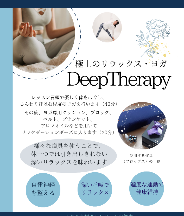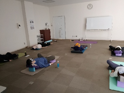 ただストレッチするだけでは届かない深い部分の緊張を、ヨガブロックやクッションなどの補助具を使いながら、少しずつ丁寧にほどいていきます。