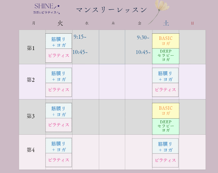 | 料金 | 単発 1,700円 【4回】回数券 6,500円 (2か月有効) 【4回】月会費 5,500円 (翌月振替不可) |